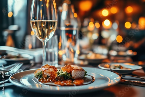 Elegant fine dining with gourmet seafood dish and a glass of white wine under warm lighting.