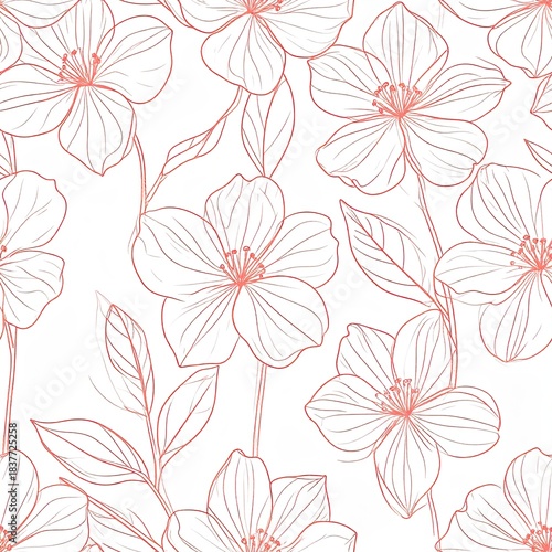 Elegant Floral Outline Seamless Pattern with Coral Flowers and Leaves on White
