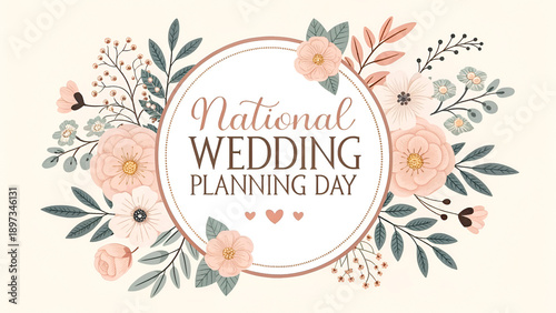 Elegant floral poster for national wedding planning day with pink flowers and green leaves on cream background
