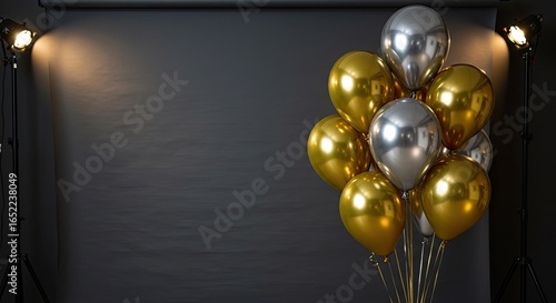 balloon, gold, silver, metallic, party, celebration, festive, event, background, dark, black, studio, lighting, shiny, glossy, decoration, anniversary, birthday, wedding, holiday, glamour, luxury, elegant, sophisticated, cheerful, joy, happiness, fun, bright, light, image, photo, photo, design, template, texture, abstract, graphic, element, asset, picture, visual, resource, material, composition, arrangement