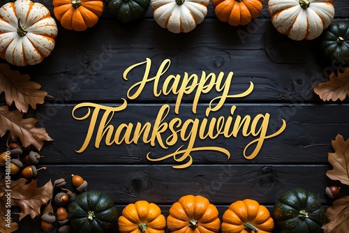 Elegant Happy Thanksgiving Image with Pumpkins and Autumn Decorations on Dark Wood Background