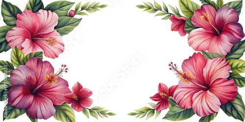hibiscus, flower, floral, arrangement, watercolor, illustration, tropical, leaf, pink, red, green, white, background, invitation, card, design, artwork, botanical, nature, summer, spring, bloom, blossom, stamen, isolated, decorative, art, painting, frame, border, corner, template, elegant