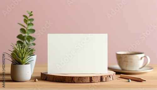 card, horizontal, design, copy space, elegant, wood, plant, hot drink, cup, desk, minimal, blank, paper, stationery, natural, decor, creative, template, background, desktop, concept, presentation, office, workspace, modern, stylish, neutral, fresh, clean, branding, aesthetic, simple, layout, showcase, refined, pastel, pink, surface, minimalistic