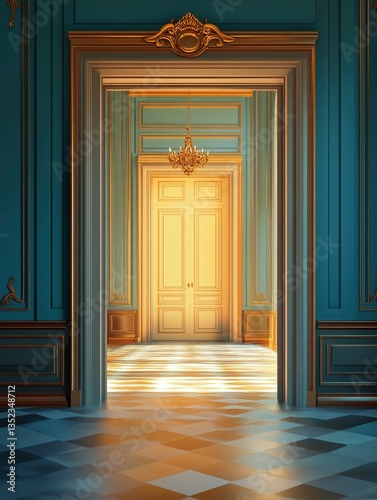 doorway, opening, hallway, interior, chandelier, door, tile, pattern, architecture, design, luxury, gold, blue, ornate, classic, style, wall, room, light, perspective, entrance, entering, leading, indoor, elegance, decoration, parquet, studio, background, floor, panel, home, residence, estate, detail, element, chequered