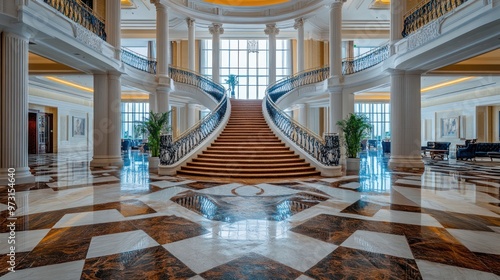 architecture, staircase, marble, luxury, interior, design, elegance, space, light, column, decor, symmetry, plant, window, ambience, opulence, flooring, entrance, hospitality, grandeur, beauty, aesthetic, style, reflections, detail, artistry, structure, open, inviting, classic, contemporary, refined, upscale, sophisticated, charme, warmth, allure, balance, calmness, comfort, welcoming, roomy, harmony, visual, layout, setting, atmosphere, life events, attracted