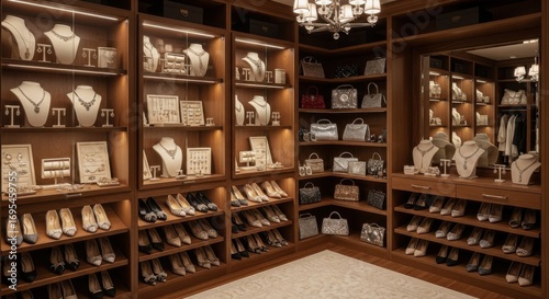 jewellery, pursed, display, luxury, boutique, wooden, shelf, organised, lighting, elegant, fashion, retail, accessory, necklace, bracelet, earring, ring, clutch, purse, shopping, interior, warm, illuminated, professional, luxurious, store, visual, arranged, displayed, fashionable, classic, sophisticated, chandelier, decor, exhibition, setting, ambience