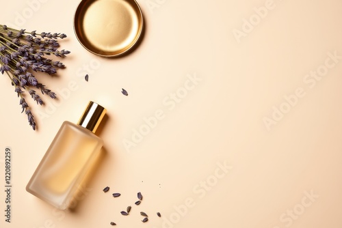 Elegant Layout with Lavender and Perfume Bottle on Soft Background