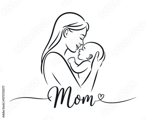 Elegant Line Art Illustration of Mother Holding Baby with Mom Script and Heart Perfect for Mother s Day and Family Designs
