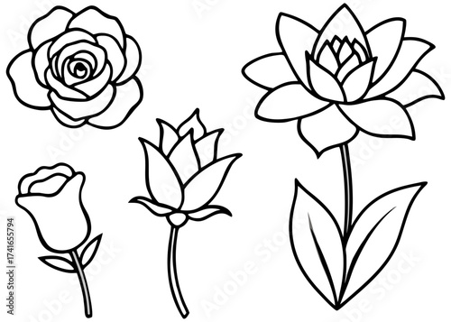 rose, lily, daisy, floral, flower, botanical, drawing, line, art, vignetting, hand, drawn, ink, monochrome, black, and, white, outline, simple, elegant, vintage, retro, design, decorative, ornamental, nature, garden, beauty, romantic, delicate, classic, traditional, aesthetic, graphic, pattern, element, motif, clip art, illustration, artistic, creativity, style, composition, arrangement, group, set, collection, sprig