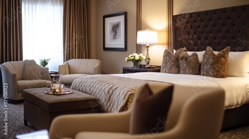 bedchamber, interior, design, luxury, elegant, decor, furniture, lighting, textile, composition, armchair, pillow, table, vase, artwork, curtain, soft, comfort, style, sophistication, aesthetic, relaxing, inviting, modern, contemporary, room, cosy, ambience, peaceful, neutral, tone, seating, space, home, hospitality, retreat, calmness, intimacy, arrangement, detail, setting, plush, warmth, bed, chic, atmosphere
