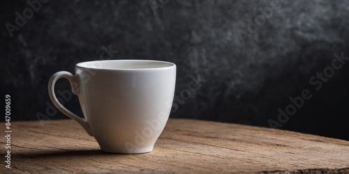 Elegant minimalist composition with a white ceramic cup sitting on a rustic wood table against a dark background