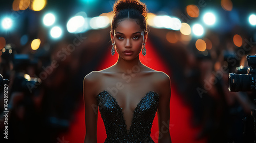 Elegant model in stunning black evening gown on the red carpet, perfect for fashion showcases, wall art, posters, decoration, and promotional materials.