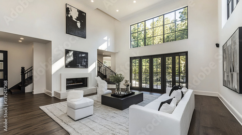 Elegant modern home interior with white walls and large windows