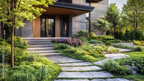 house, architecture, modern, landscape, design, exterior, building, stone, front, yard, garden, grass, pathway, paseo, plant, tree, step, entrance, home, contemporary, facades, residential, estate, property, luxury, greenery, outdoors, bush, shrub, paver, patio, sidewalk, daylight, sunlight, foliage, natural, perspective, tranquil, elegant, inviting, manicured, pristine, serene, upscale, peaceful, beautiful, clean, airy