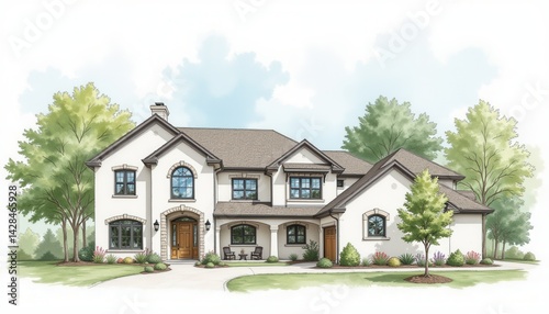 Elegant Modern Residence Watercolor Illustration Suburban Area Art Style Tranquil Setting Front View Contemporary Design