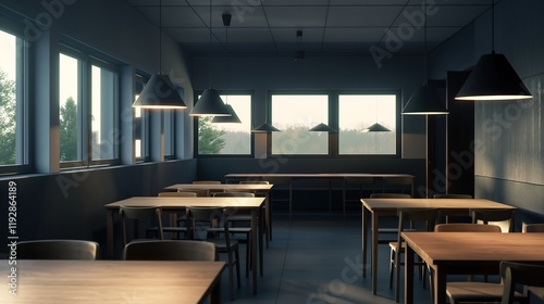 Elegant Modern Restaurant Interior: Minimalist Design with Soft Lighting and Welcoming Ambiance for Fine Dining. Commercial design, decoration, catering industry, hotel, tourism, real estate marketing