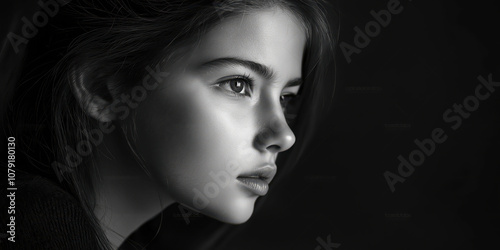 elegant, monochrome, portrait, reflective, young, contemplation, gaze, serene, thoughtful, beautiful, artistic, expression, emotion, black, white, depth, moody, introspective, profile, feminine, soft, shadow, light, mysterious, classic, timeless, sharpened, intense, glance, isolated, face, feature, detailed, skin, texture, visual, aesthetic, beauty, model, coiffure, tranquil, contemplative, pensive, calm, subtile, natural, peaceful