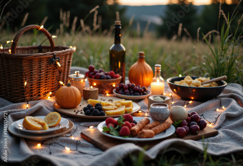 picnic, cheese, fruit, grape, berry, bread, wine, candle, basket, platter, bottle, bowl, plate, cosy, scenic, nature, celebration, feast, meal, snack, fresh, delicious, rustic, relaxing, summer, evening, ambience, setting, table, arrangement, organic, healthy, tasty, epicure, leisure, enjoyment, peaceful, countryside, copy space