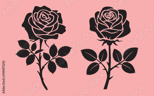 rose, silhouette, rose petal, stem, thorn, black-and-white, monochrome, clip art, design element, graphic design, floral pattern, elegant, pair, silhouette, detailed, flower petals, leaf