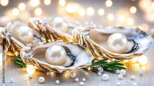 Elegant Pearls in Oyster Shells with Soft Lighting and Festive Holiday Theme