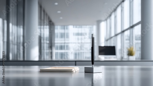 pen, notepad, modern, office, corporate, professional, desk, workplace, business, workspace, interior, design, architecture, building, window, light, clean, simple, minimalist, contemporary, sleek, executive, luxury, finance, banking, legal, insurance, technology, communication, writing, stationery, equipment, supply, metal, chrome, silver, table, indoor, blurred