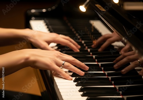 Elegant pianist fingers dancing across the piano keys in a passionate musical performance creating immersive experience