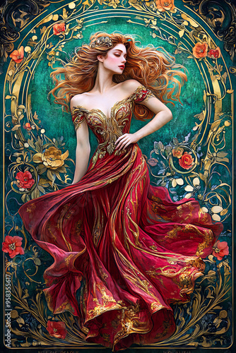 Elegant portrait of a woman with floral patterns in vintage romantic retro art nouveau poster style, perfect for stylish backgrounds, new beautiful stock image illustration AI