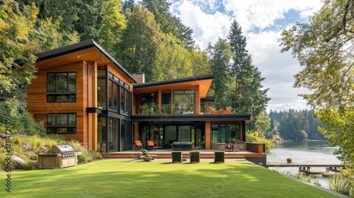 Elegant riverside house with an expansive lawn and a private dock for boating activities.