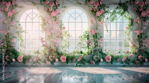 Elegant Room Wall with Arched Windows and Floral Wallpaper Display.
