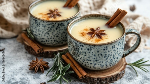 Elegant speckled mugs filled with creamy spiced drink topped with star anise and cinnamon sticks, beautifully presented on wooden coasters for a rustic charm.. AI Generation