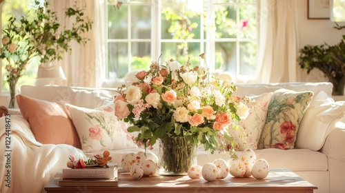 floral, arrangement, spring, flower, pastel, colours, vase, table, living, room, interior, design, decor, soft, light, cosy, home, atmosphere, celebration, holiday, nature, freshness, beauty, easter, egg, cushion, fabric, artistic, seasonal, warmth, bloom, flower petals, greenery, window, sunlight, joy, calmness, style, decoration, casual attire, elegance, comfort, fresh, lifestyle, inspiration, charming, inviting, peaceful, rustic