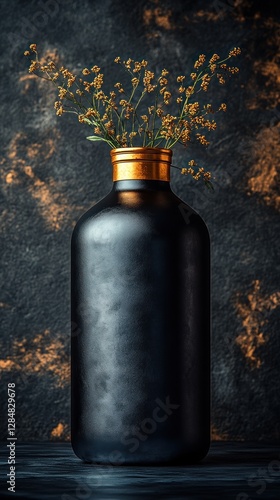 vase, flower, still, life, black, gold, dried, decor, beauty, elegant, artistic, design, home, interior, photo, image, dark, texture, background, metal, style, arrangement, composition, minimal, simple, modern, dramatic, light, shadow, contrast, aesthetic, vintage, object, art, picture, flora, nature, plant, detail, closeup