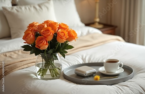 Elegant still life orange roses in glass vase on luxurious bed. Coffee cup, tray, bedside lamp, neutral colors. Home decor, comfort, relaxation, morning ritual, luxury hotel room.