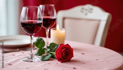 Elegant Table Setting with Glasses of Red Wine and a Rose on a Romantic Dinner Table