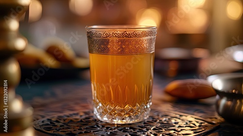 Elegant tea glass adorned with intricate gold patterns on ornate table
