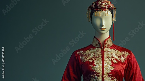Elegant Traditional Chinese Dress Displayed on a Mannequin, Showcasing Intricate Embroidery and Cultural Heritage Against a Muted Background