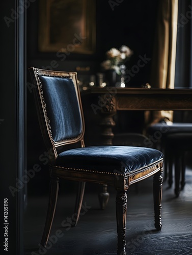 chair, furniture, interior, design, classical, elegance, velvet, wood, home decor, antique, decorative, style, luxury, table, room, cosy, artistic, modern, vintage, blue, sitting, scene, lighting, shadow, texture, dining, artwork, sophisticated, warmth, rustic, detail, comfort, lifestyle, collection, indoor, atmosphere