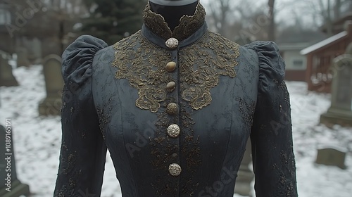 winter, garment, stylish, black, high, historical, vintage, embroidery, buttons, outerwear, cemetery, gloomy, fashion, cotton balls, dark, academe, romantic, gold, jacket, accent, apparel, sleeve, cemetery, snow, textured, antique, ornate, detail, mysterious, elegant, design, old, retro, victorian, collar, texture, moody, gothic, aesthetic, fabric, woman, costume, clothing, lace