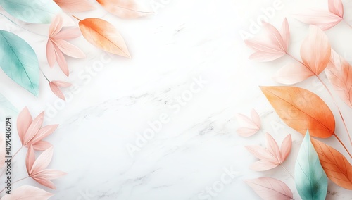 Elegant watercolor background with delicate blue and orange leaves on a marble backdrop. Perfect for invitations, stationary, or artistic projects.