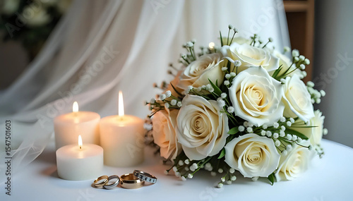 Elegant wedding bouquet of white roses and baby's breath with glowing candles and rings, wedding bouquet with candles