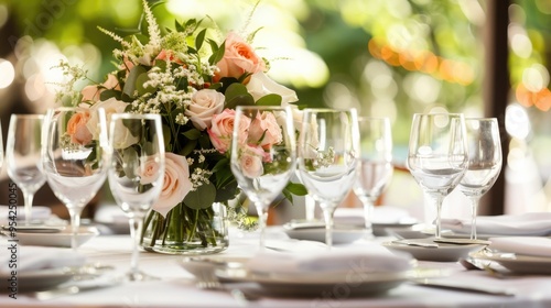 Elegant wedding reception table setting with floral arrangements, sparkling glassware, and fine dishes.