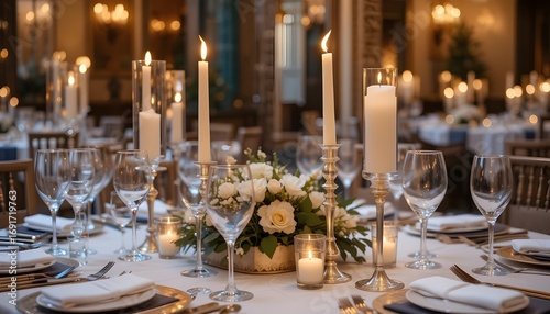 wedding, reception, table setting, elegant, romantic, candlelight, dinner, event, celebration, formal, luxury, decor, floral arrangement, white rose, wine glass, silverware, napkin, fine dining, gathering, special occasion, banquet, venue, interior, ambience, atmosphere, sophisticated, festive, hospitality, catering, party, marriage, engagement, anniversary, banquet hall, exquisite, refined, memorable
