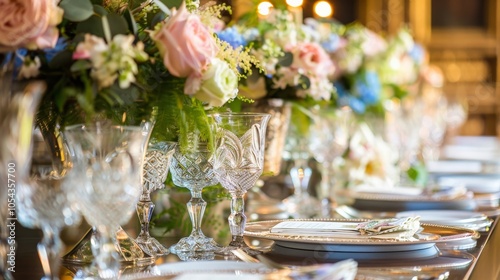 Elegant wedding reception table with fine china, crystal glassware, and floral centerpieces