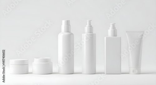 elegant white blank cosmetic bottles and jars collection mockup for premium skincare brand identity design presentation