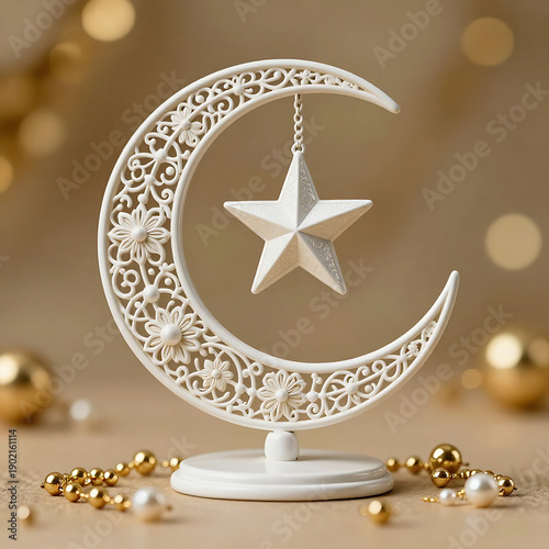 moon, crescent, star, ornament, decoration, white, gold, festive, holiday, sculpture, racked, lace, pattern, intricate, design, bead, bokeh, light, soft, background, celestial, ramadan, eid, christmas, celebration, elegant, delicate, craft, art, symbol, spirituality, religion, culture, tradition, seasonal, glowing, warm, cosy, home, decor, interior, still, life, closeup, detailed, texture, shiny, metallic, luxury