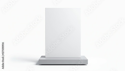 Elegant White Matte Display Stand with Glossy Reflection on White Background. A blank white sign stands on a white surface.