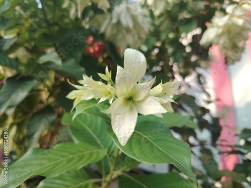 Elegant White Mussaenda Flower Blossoming in Natural Light A Captivating Botanical Garden Specimen Close Up View