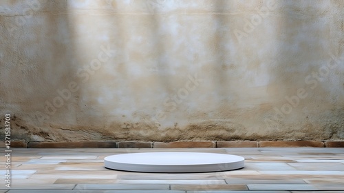 round, platform, pedestal, display, racked, stage, dais, footed, circle, white, empty, blank, background, texture, wall, grunge, concrete, stone, rough, aged, weathered, vintage, rustic, mottled, light, shadow, beam, ray, sunlight, illumination, interior, space, room, floor, tile, minimalist, simple, clean, modern, contemporary, design, architecture, presentation, product, showcase, surface, exhibition