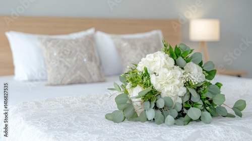 Elegant white wedding bouquet on crisp bed linens serene and tranquil bedroom setting