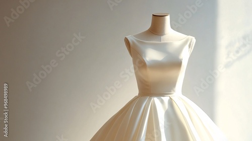 Elegant White Wedding Dress on Mannequin Against a White Wall.